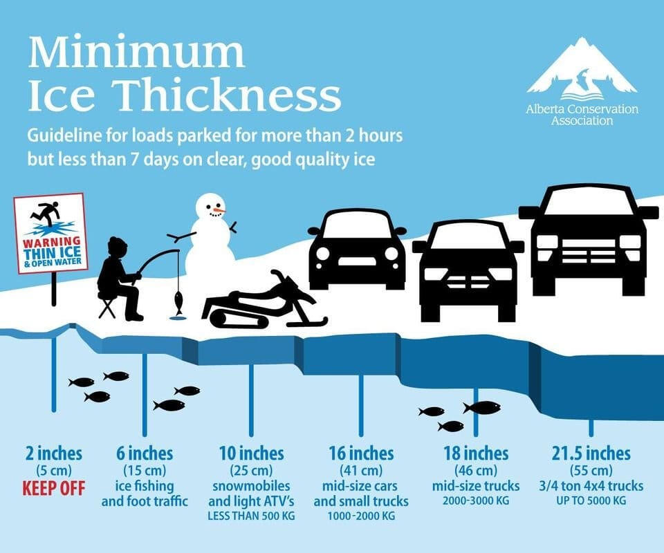 • Ice thickness is variable. Ice may be thinner in some areas compared to others. Do not assume all ice in a given area is safe.